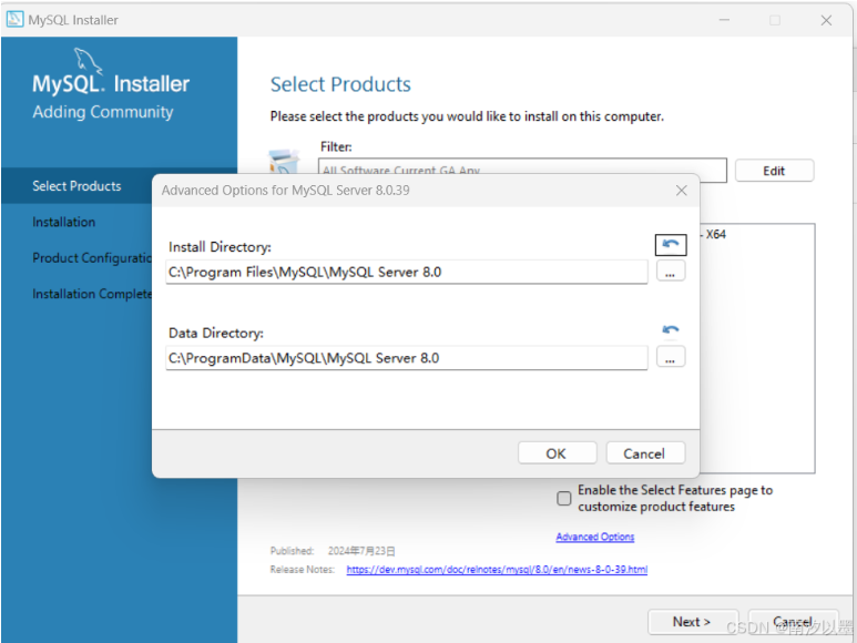 我们点击刚刚添加在右边框框的,点击下面出现的Advanced OPtions For MySQL,这样我们就可以自定义安装了,这个路径记着,待会配置环境要用。