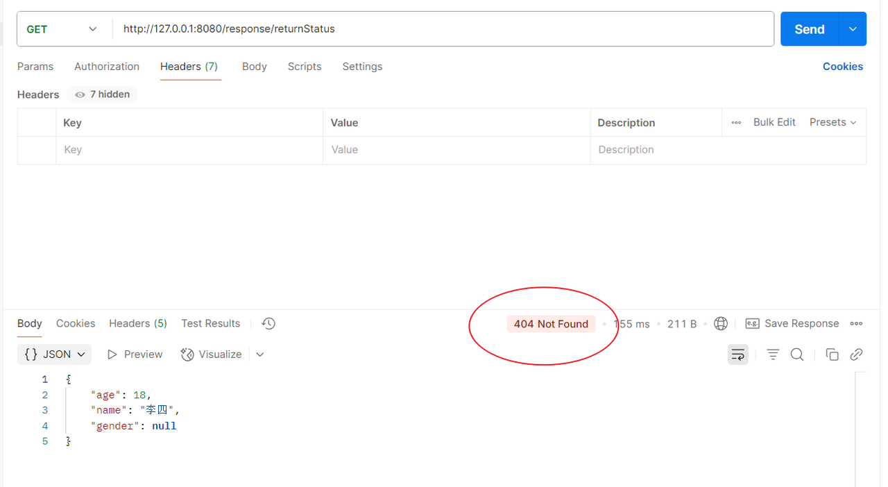 同样的,可以看到即使的得到结果了,也是返回404,这是因为我们手动设置了。