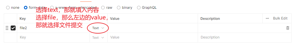 form-data:用于模拟HTML表单提交,通常用于上传文件或发送键值对数据。