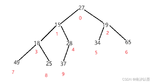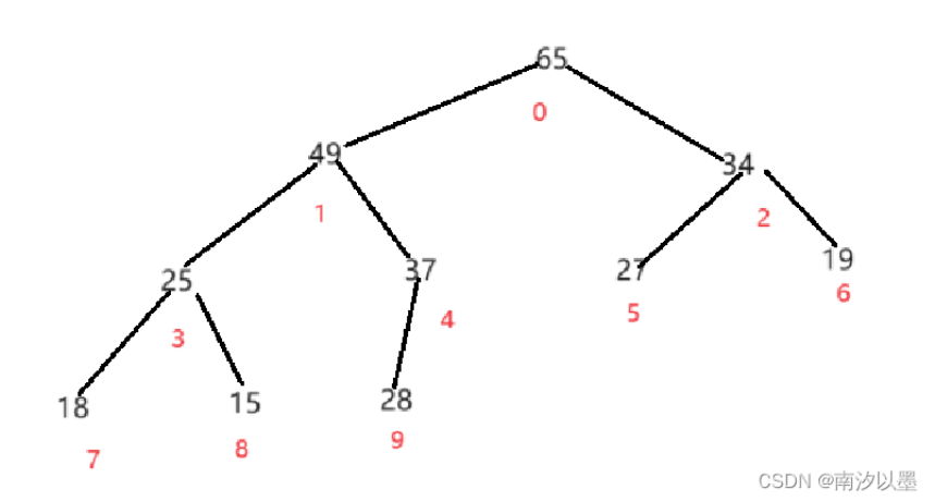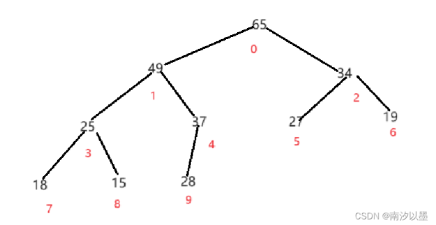 将我们的28和65交换位置,然后让UsedSize--,到了下标为8的位置,接着,让0(28)下标和UsedSized分别作为开始和结束进行向下调整,直至成为大根堆:
