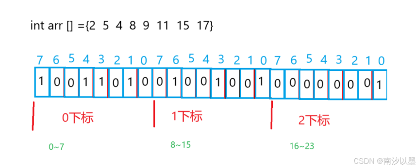 所以数组arr中,每个数字可以通过某个算式来确定某个位置,然后将某个位置的比特位设置为1,说明,此数字存在。