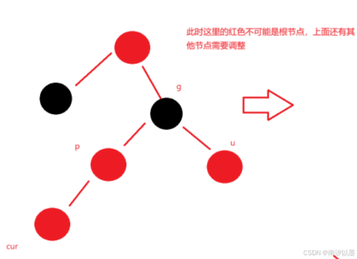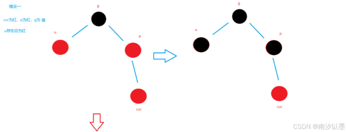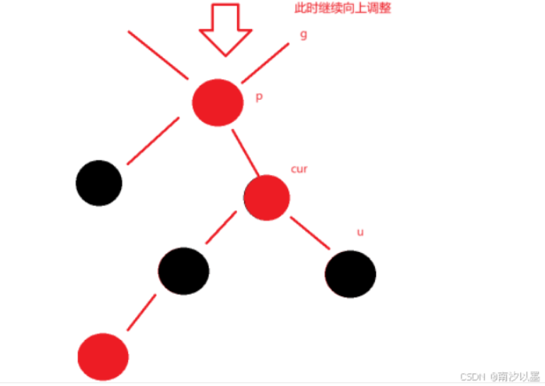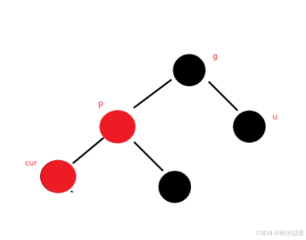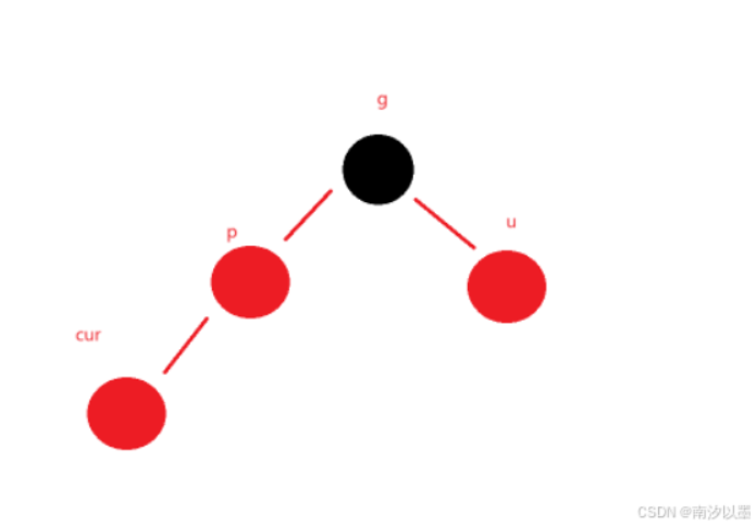 那么我们插入节点的时候就会遇到两个节点是红色的,所以此时违反了红黑树的性质,那么就要进行颜色的调节