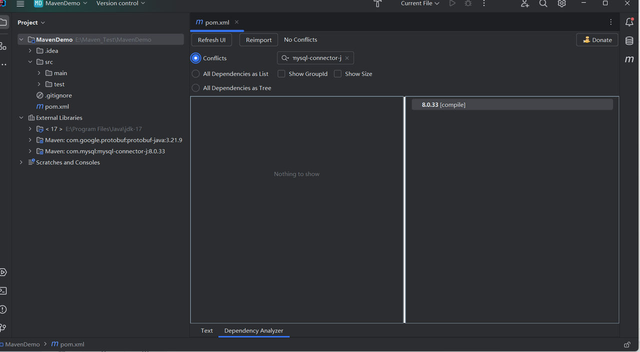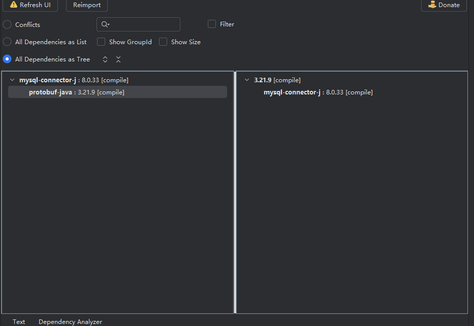 点击下面的dependency analyze,再点击all Dependencies as tree/list,都可以看到pom.xml引入的依赖