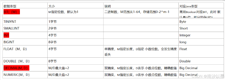 以下为数值类型:
