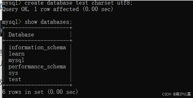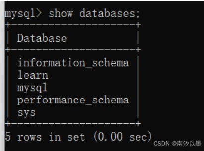 这里我们查看当前有什么数据库,当然,MySQL这里内置了几个(除去learn其他都是),暂且先不做处理。